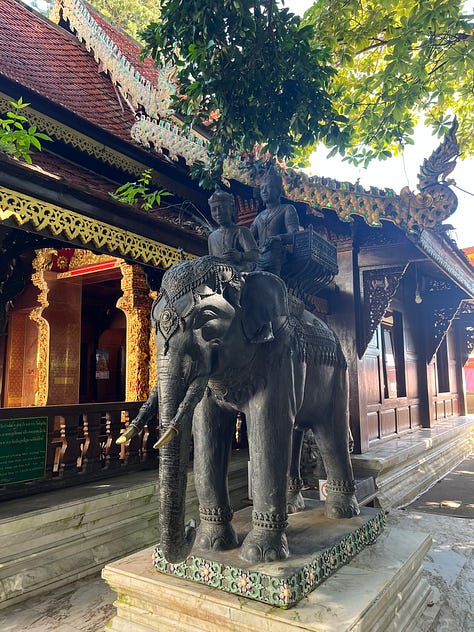 We kept exploring and soon learned the temple was built to honor a white elephant that carried a sacred Buddha relic up the mountain, trumpeted three times, and then died at the very spot where the temple now stands (Caleb feels this is particularly understandable after that hike).